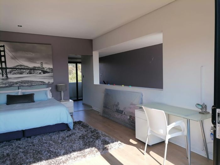 Modern home with open lounge, dining, integrated kitchen, solar-powered garage, three bedrooms, pyjama lounge, and off-grid features.