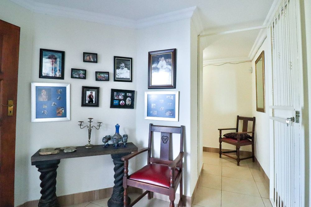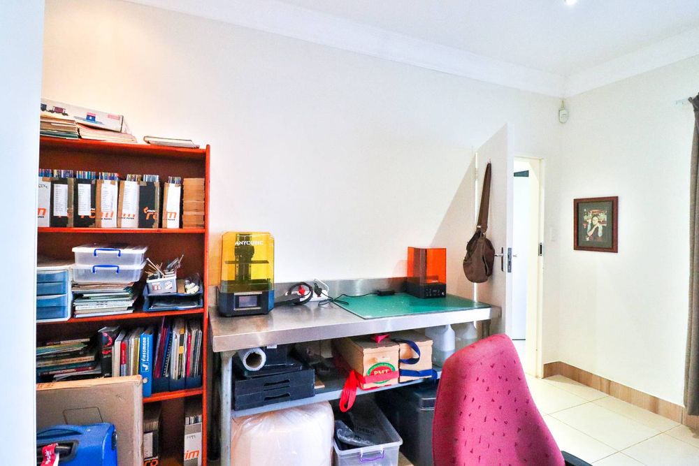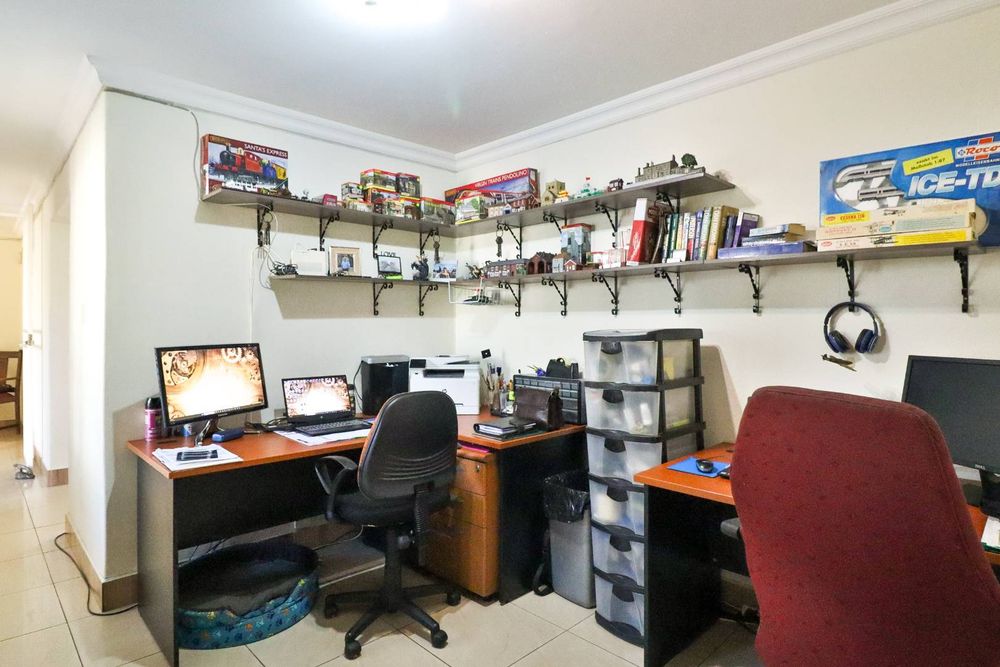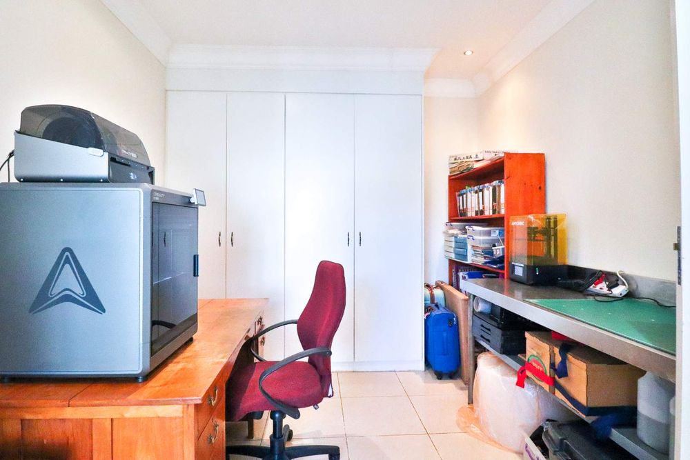 This home boasts three generously sized, neatly tiled bedrooms, each equipped with built-in cupboards and retractable automated ceiling fans. The main bedroom is a sanctuary of comfort, featuring extra cupboard space, built-in drawers, and a dressing table. A versatile study can easily double as a fourth bedroom or home office, catering to your evolving needs.