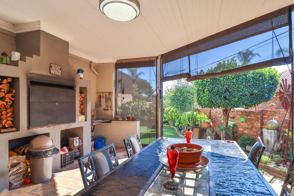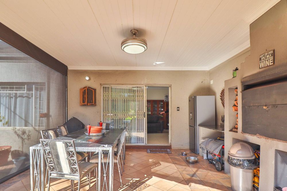 Step out from the lounge onto the stunning covered patio, designed for year-round enjoyment with solar screen blinds to maintain comfort in any season. The patio features a built-in braai with wood storage cutouts, a serving area, wash-up basin, electricity access, and an automated outdoor ceiling fan—all overlooking a meticulously manicured garden enhanced by the soothing sounds of a water feature.