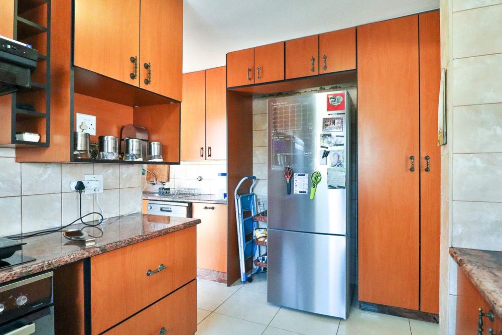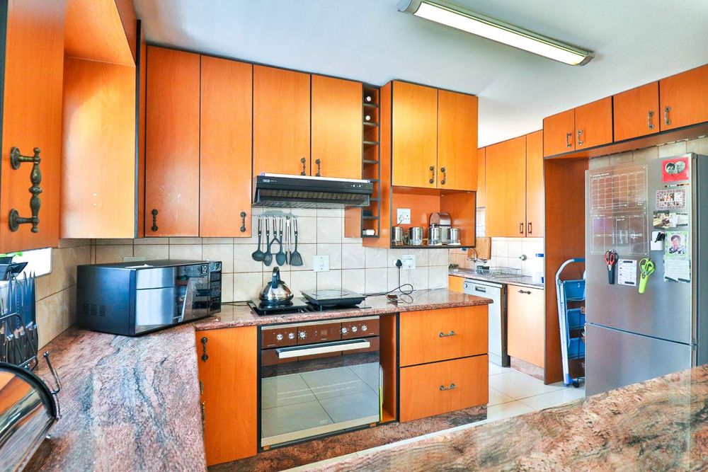 The semi-open-plan kitchen is a chef's delight, featuring exquisite rose quartz countertops, ample cupboard space, and a cozy breakfast nook. A separate scullery offers added convenience, with space for a double-door fridge. The back door leads to an independent laundry area with a toilet and a spacious courtyard equipped with a retractable washing line.