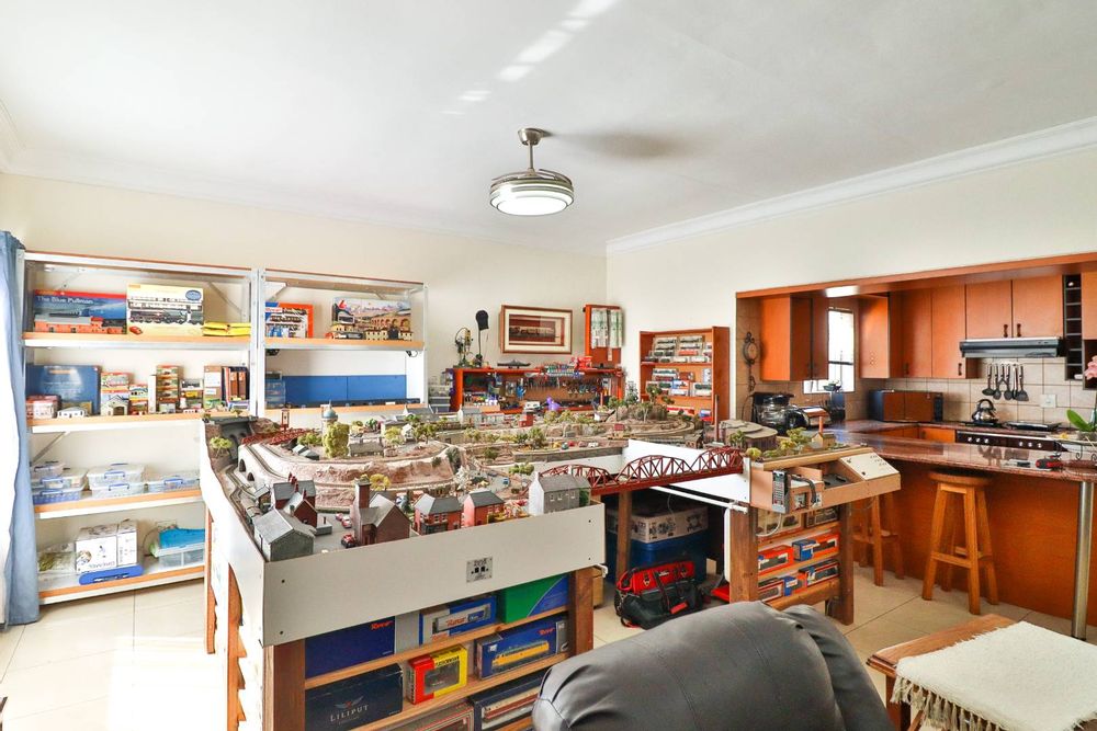 Step out from the lounge onto the stunning covered patio, designed for year-round enjoyment with solar screen blinds to maintain comfort in any season. The patio features a built-in braai with wood storage cutouts, a serving area, wash-up basin, electricity access, and an automated outdoor ceiling fan—all overlooking a meticulously manicured garden enhanced by the soothing sounds of a water feature.