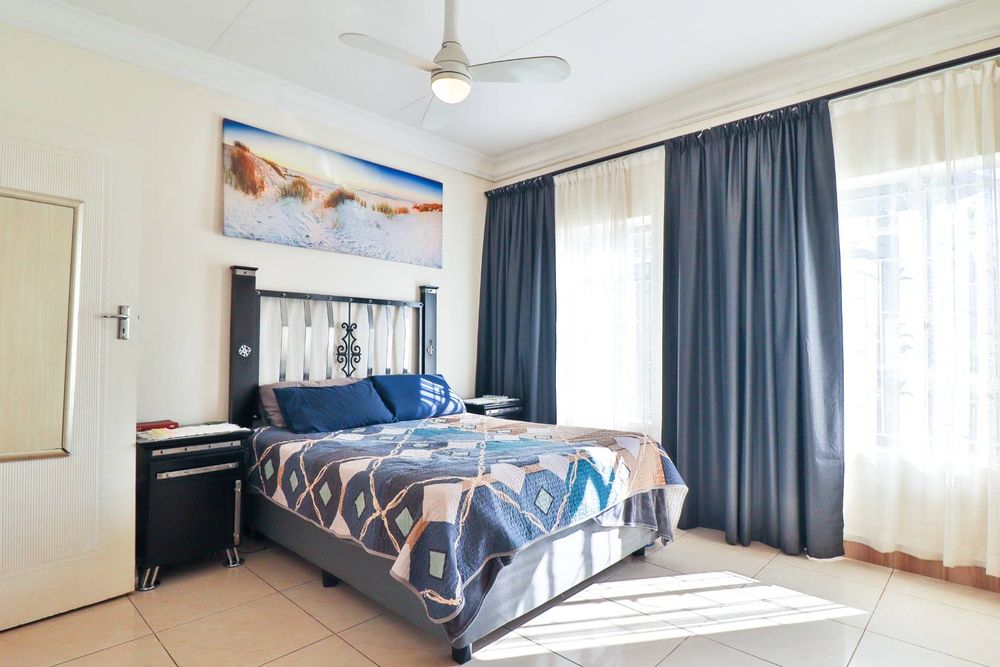 This home offers additional conveniences such as being in a ''no load shedding area'', a solar geyser on a timer, underfloor heating, remote-controlled retractable ceiling fans, prepaid electricity, Venetian blinds, and a water feature. Tiled throughout with wide passages, you'll also find a linen closet and an outdoor storage area for all your gardening equipment.