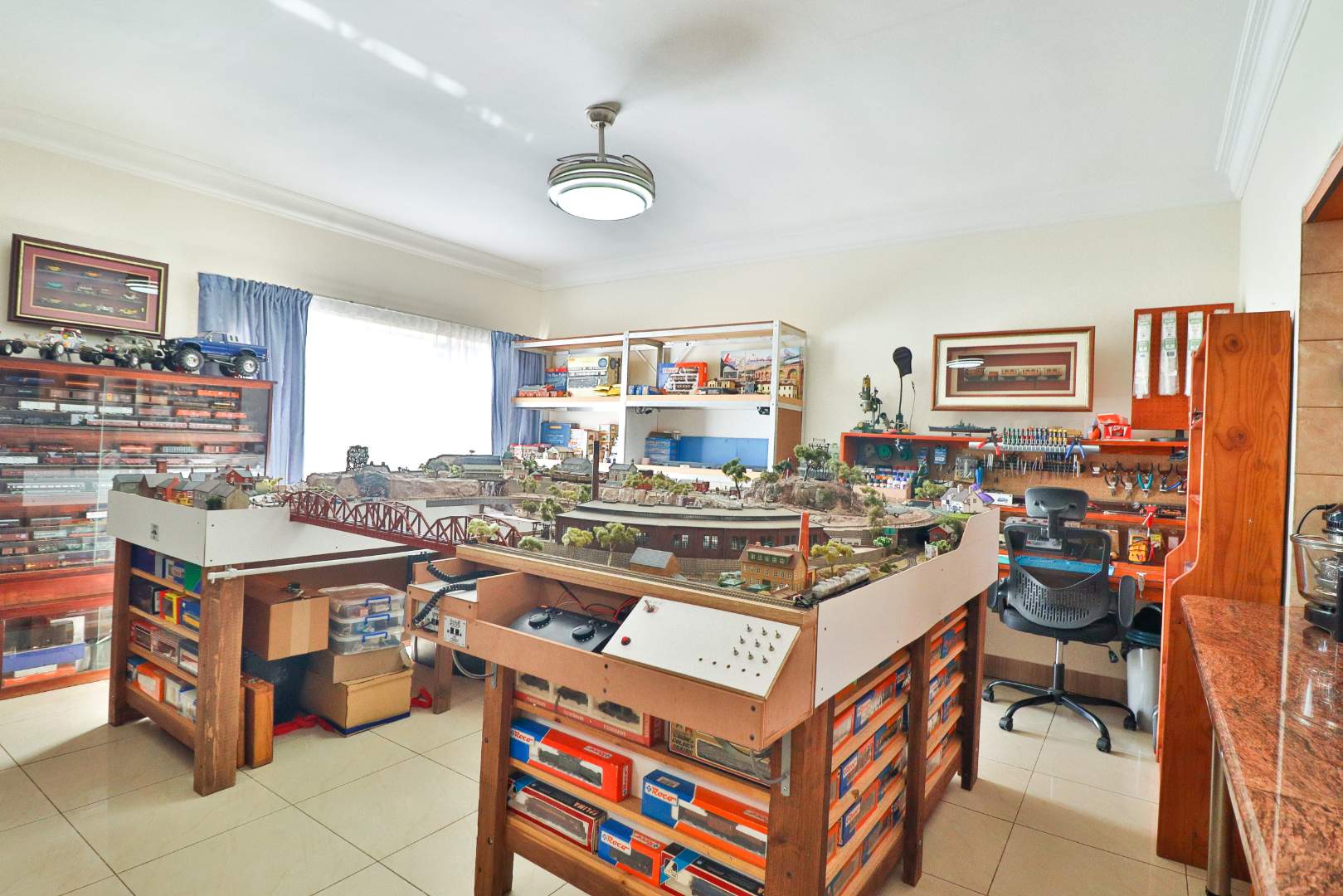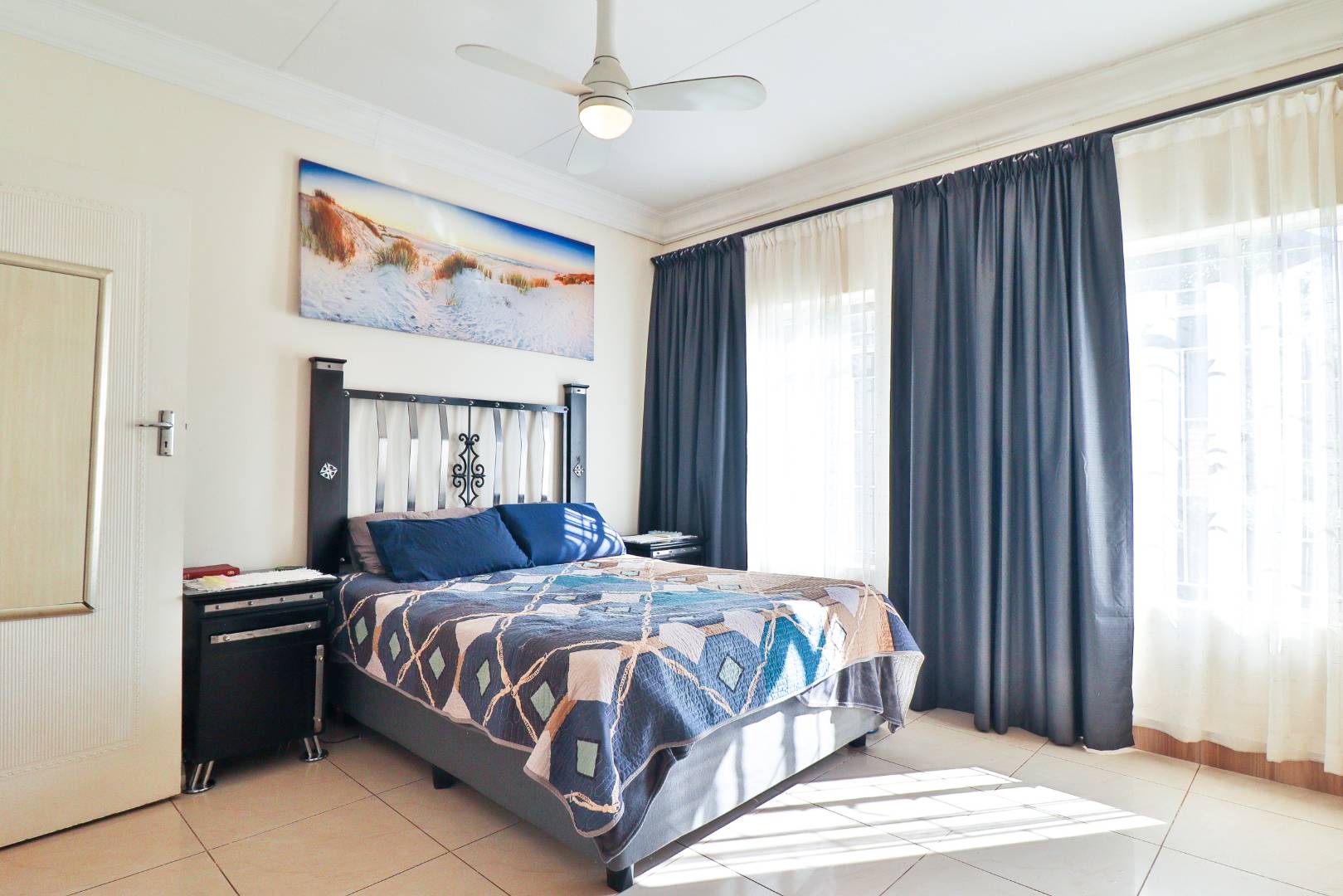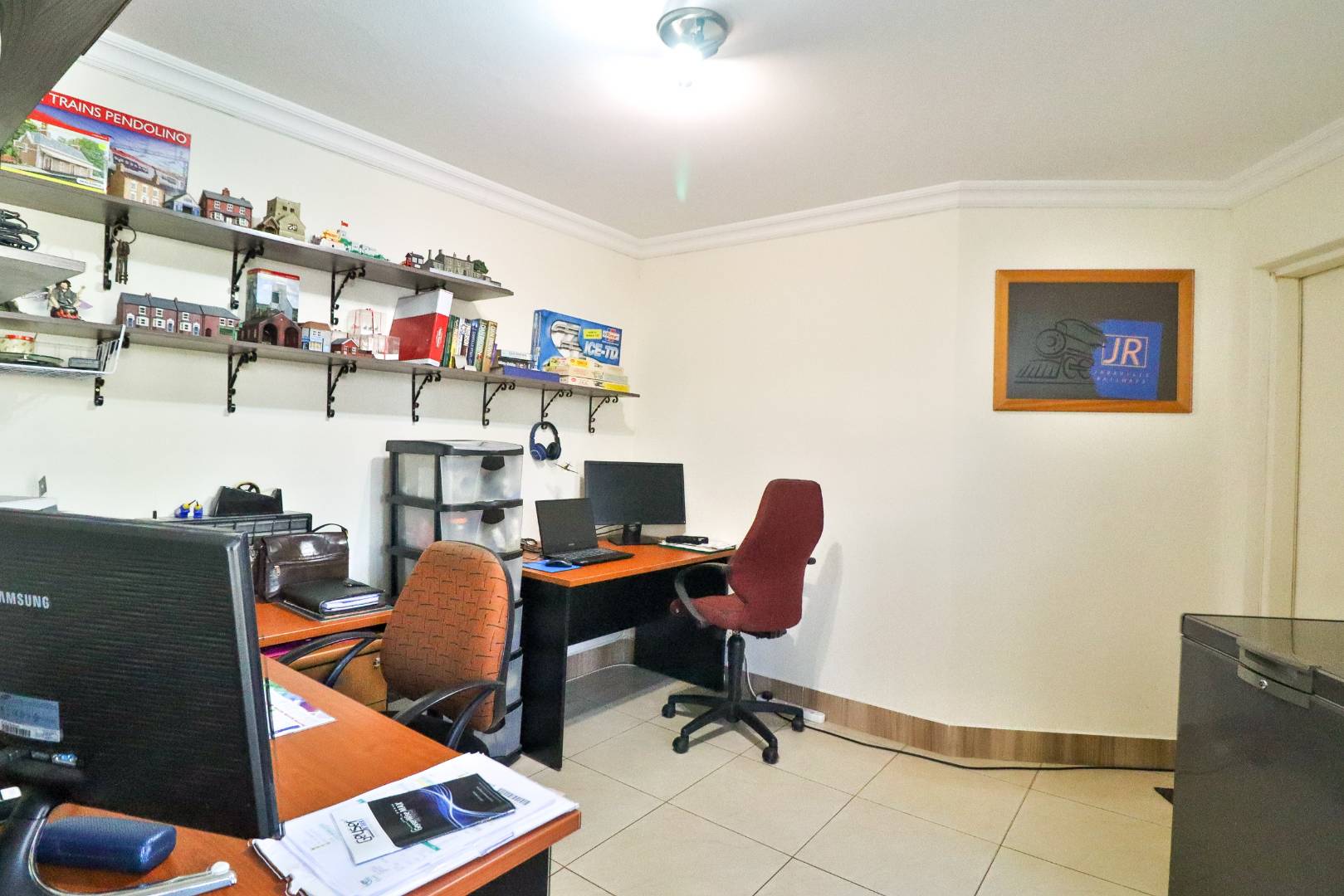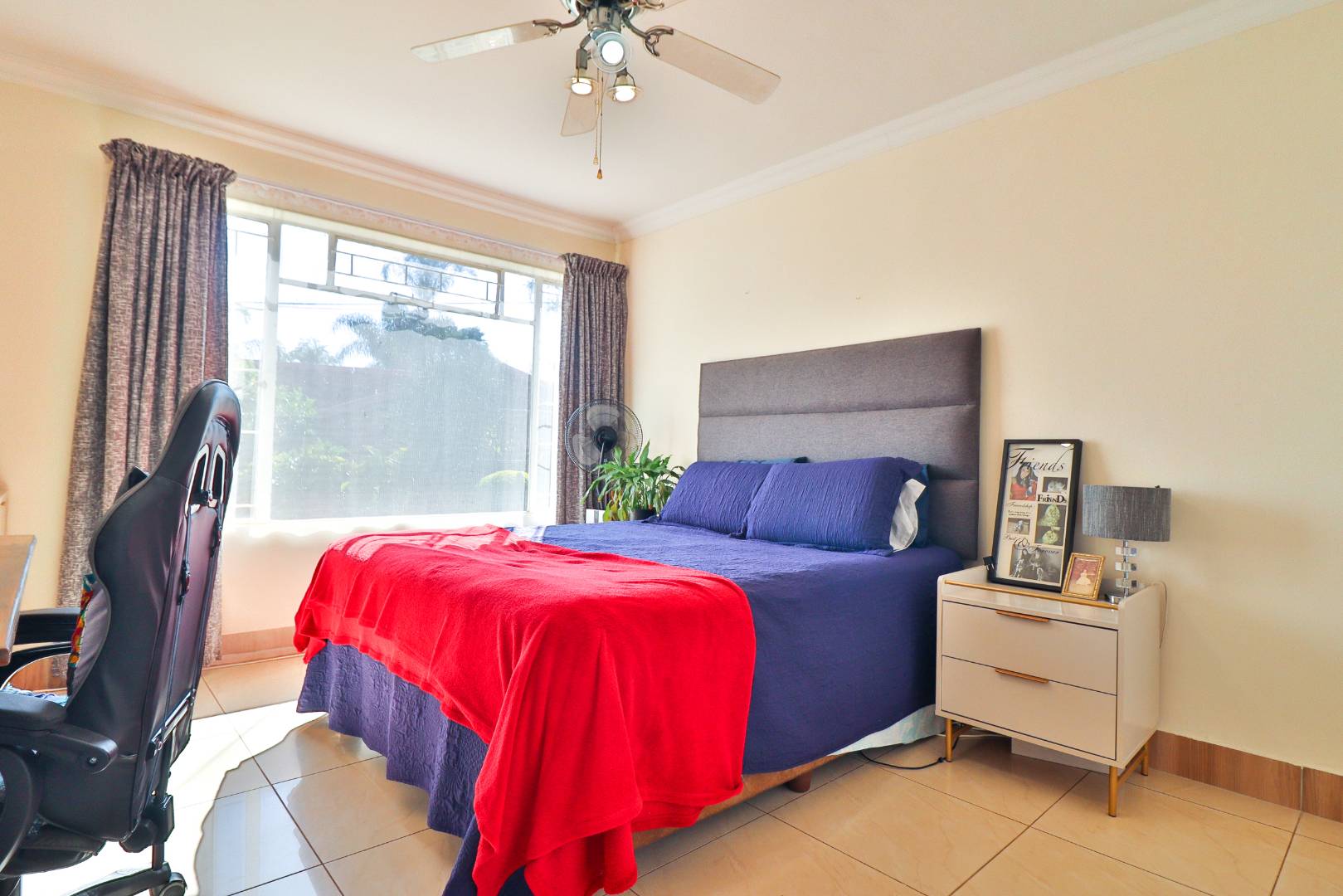 This home boasts three generously sized, neatly tiled bedrooms, each equipped with built-in cupboards and retractable automated ceiling fans. The main bedroom is a sanctuary of comfort, featuring extra cupboard space, built-in drawers, and a dressing table. A versatile study can easily double as a fourth bedroom or home office, catering to your evolving needs.
