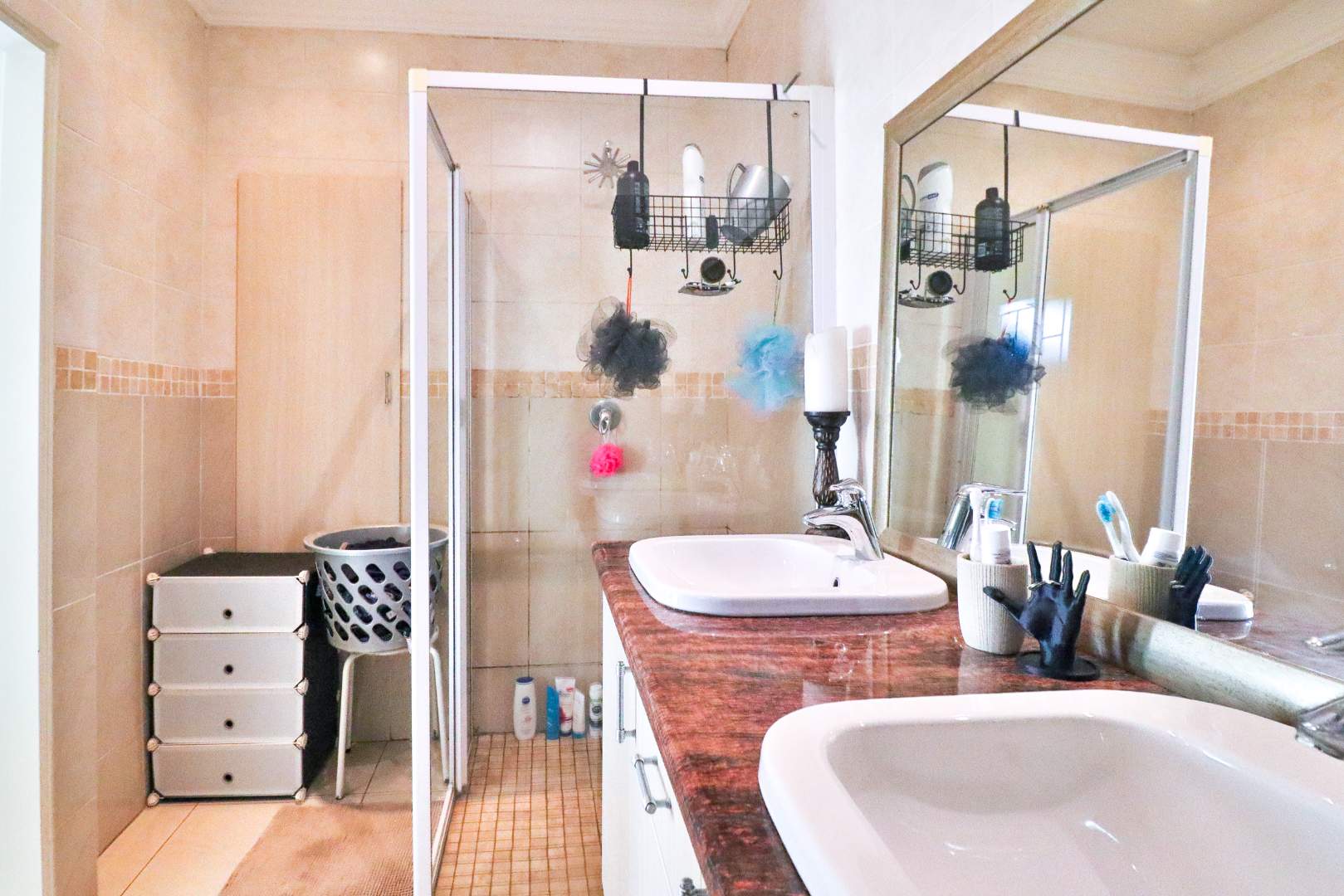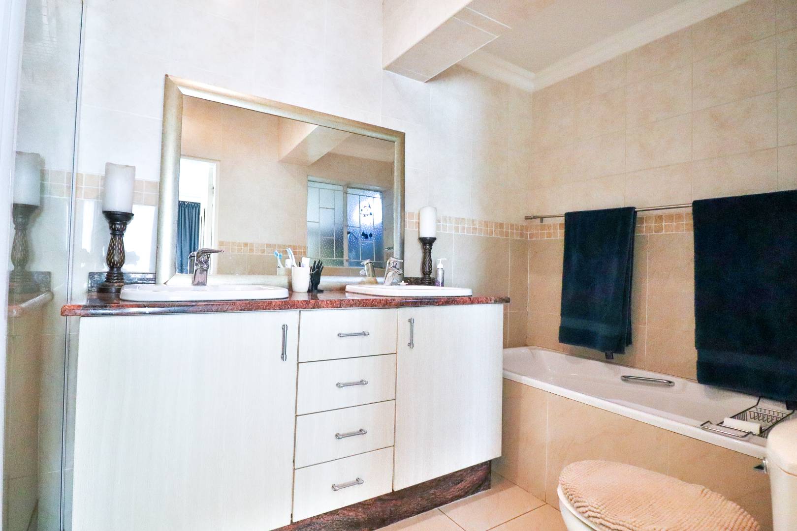Indulge in the elegance of the main en suite bathroom, complete with his and hers basins elegantly set on rose quartz. This full bathroom includes both a shower and a bath. The second bathroom is modern and spacious, featuring a large shower and a separate toilet, making it perfect for guests.